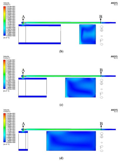 Velocity contour: (a) t = 0 s; (b) t = 0.2 s; (c) t = 0.4 s; (d) t = 0.67 s.