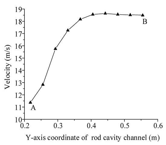 As seen in Figure 7, during the extension movement of the actuator, the flow speed of the oil increases after it enters the rod cavity channel from the rod cavity, whilst the speed of other parts, such as the rodless cavity, does not change significantly. The flow speed from point A to point B at 10 positions at t = 0.67 s is determined. The velocity curve is shown in Figure 8. The maximum flow speed from point A to point B is 18.63 m/s, and the flow speed at most locations is stable near this velocity. Therefore, during the extension movement of the actuator, the flow speed of the rod cavity channel is too fast to be achieved in the experiment, so the rod cavity channel should be redesigned to reduce the flow speed.