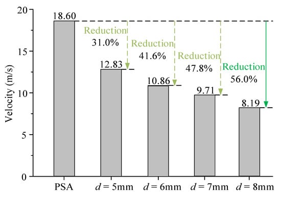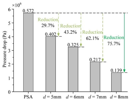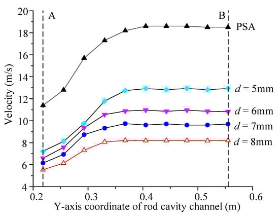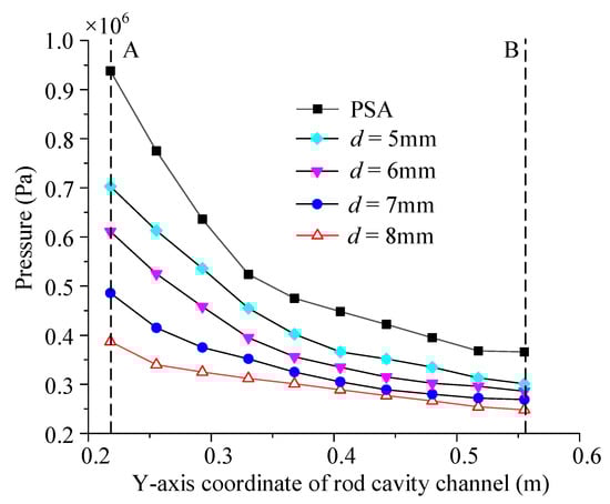 Figure 12 and Figure 13 demonstrate that when the diameter d of rod cavity 4-2 is 5 mm, 6 mm, 7 mm and 8 mm, respectively, the pressure drop from point A to point B decreases by 29.7%, 43.2%, 62.1% and 75.7%, respectively, compared with PSA, and the steady flow speed between points A and B decreases by 31.0%, 41.6%, 47.8% and 56.0%, respectively. Therefore, on the premise of ensuring the structural strength and not changing the installation size, the diameter d of rod cavity channel 4-2 should preferably be 8 mm.