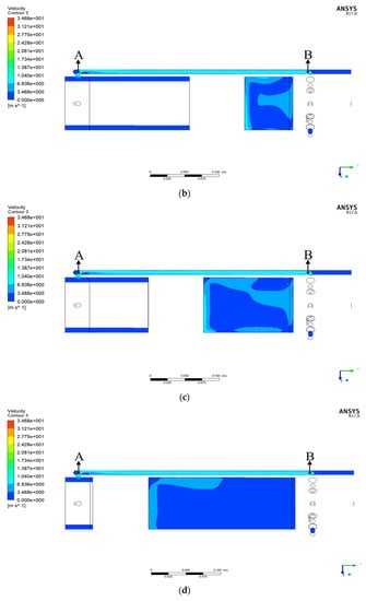 As seen in Figure 10 and Figure 11, the larger the diameter of rod cavity channel 4-2, the smaller the pressure and pressure drop from point A to point B, and the lower the steady flow speed between points A and B. A comparison of the pressure drops from point A to point B with different diameters is shown in Figure 12, and a comparison of the steady flow speeds is displayed in Figure 13.