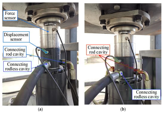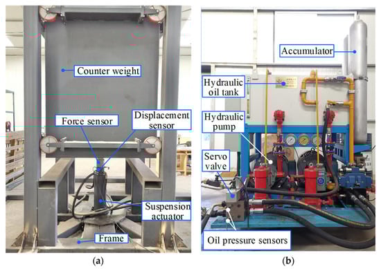 To further compare the performance of the PSA and APCSA, a suspension actuator test bench is established, as shown in Figure 16. The APCSA test bench is divided into an actuating bench and a pumping station. The actuating bench includes a counterweight, a force sensor, a suspension actuator and a frame, etc. The pumping station includes an electro-hydraulic servo valve, an oil pressure sensor, a hydraulic pump, a hydraulic oil tank and an accumulator, etc. The PSA is shown in Figure 17a, and the APCSA is shown in Figure 17b. In the experiment, the diameter of rod cavity channel 4-2 is 8 mm, and the mass of the counterweight is 1000 kg. In addition, the pressure at the pump outlet is 9 MPa.