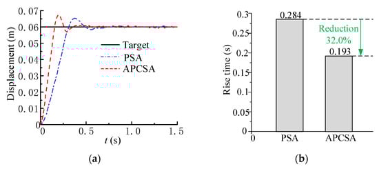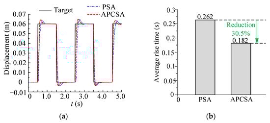 As seen in Figure 19, under the square wave signal, the response time of the APCSA during rising and falling decreases. A comparison diagram of the mean values for rising to 0.06 m three times is shown in Figure 19b. The mean time of the PSA rising to 0.06 m is 0.262 s, and the mean time of the APCSA rising is 0.182 s, which is 30.5% lower than that of the PSA. Therefore, the response speed of the APCSA is proven to be significantly improved once again.