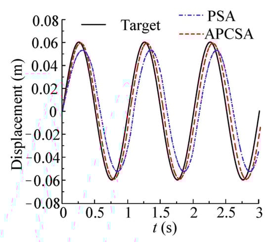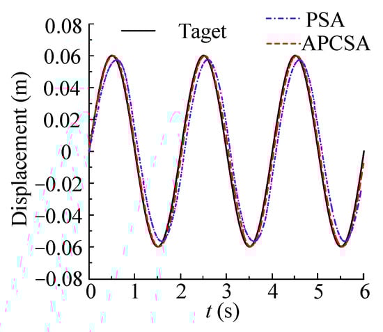 Figure 21 and Table 1 show that under the sinusoidal signal with a frequency of 1 Hz, the displacement curve of the PSA lags behind obviously, the time delay is 0.13 s, and the amplitude attenuation ratio is obvious, with a rate of 10.8%. The APCSA has a good displacement following effect, with a time delay of 0.05 s and an amplitude attenuation ratio of 0.5%. To summarize, the higher the target frequency, the more obvious the performance improvement achieved.
