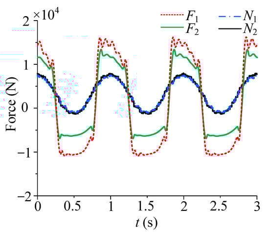 The actual output force N of the actuator can be obtained using the force sensor. The theoretical output force of the PSA is F1, and the actual output force is N1. The theoretical output force of the APCSA is F2, and the actual output force is N2. The output force curves are shown in Figure 22.