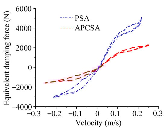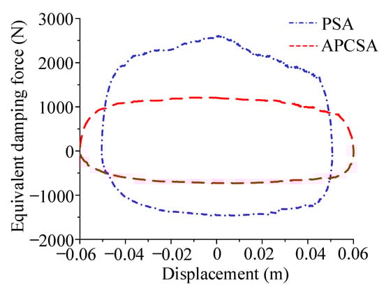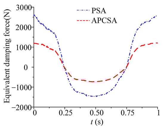 The maximum restoring damping force/compression damping force can be obtained from Figure 24 and Figure 25. As shown in Table 2, the maximum restoring damping force/compression damping force of the PSA reaches 2608.16 N/−1472.51 N, indicating that substantial energy is consumed in the actuator, which presents a disadvantage for the control of electro-hydraulic active suspension. The maximum restoring damping force/compression damping force of the APCSA is 1209.88 N/−735.35 N, which is 53.6%/50.1% lower than that of the PSA, thus improving the dynamic response capability of the actuator. The driving road surface of emergency rescue vehicles is complex and diverse, and when the suspension is in active mode, the suspension actuator should have a fast response rate and high control accuracy. The maximum resilience damping force/compression damping force of the actuator is reduced by the redesign, so that it satisfies the requirements of active suspension for the actuator. Such a redesign lays the foundation for improving the driving smoothness and handling stability of emergency rescue vehicles on complex road surfaces.