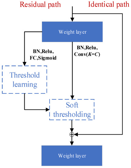 where represents the calculated threshold value. In the deep residual shrinkage network, the threshold value must be positive and cannot be greater than the maximum absolute value of the feature map. Otherwise, according to the formula, the final output will be 0. Through this soft thresholding method, the threshold value can be kept within a small positive range. Due to the special structure of the depth residual shrinkage network, each sample can form a set of thresholds according to its own characteristic graph so that noise and redundant features can be reduced for specific samples.
