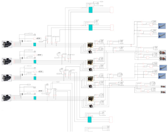 The data in this paper come from an aviation AC main power supply simulation model. This paper combines research data and experimental verification to construct a simulation model of a typical aircraft four-channel power supply system based on the Simulink tool in MATLAB. Moreover, this paper also combines the real parameter data of the power supply system provided for model modification and improvement. In this model, four three-phase alternators are used to supply power, which constitute a constant-speed and constant-frequency AC power supply system, and its four AC channels are not connected in parallel. The secondary power supply uses variable voltage rectifiers for a 270 V variable voltage rectifier and a 28 V variable voltage rectifier, and each is connected to one 270 V variable voltage rectifier and one 28 V variable voltage rectifier (high voltage and low voltage), respectively. At the same time, the first and second channels’ DC power supply comes through the convergence bar for power integration, and the third and fourth channels’ DC power supply comes through the convergence bar for power integration. The DC power supplies are connected to two hydraulic pump loads (high voltage loads, working in parallel) and two resistors (low voltage loads, working in parallel). There are also four AC loads in the system, represented by two three-phase resistors, which are connected to four generators. The simulation model graph of the power supply system is as follows (Figure 6):