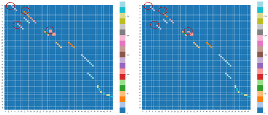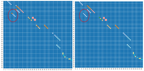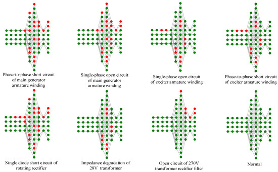 To further validate the feature extraction capability of the associated fault mode graphs of the power supply system proposed in this paper, specific fault points are removed in this paper. This is carried out to verify the robustness and accuracy of the feature extraction and fault diagnosis of the model in the absence of parameters. In the experiment, the data points of No. 1 main motor, No. 1 rectifier, No. 1 auxiliary exciter, No. 1 main exciter, and No. 1 rotary rectifier in the associated fault graph of the power supply system are set to zero to simulate the actual monitoring environment in which the monitoring parameters of No. 1 main power supply are missing in order to verify the fault diagnosis effect of the model under the condition of missing fault parameters. Figure 17 shows the graphs of the normal state before and after the missing parameters. From the figure, it can be seen that due to the missing parameters of the main power supply components, the points of the related fault mode graph are also missing.