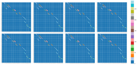 The Warshall algorithm is an algorithm for finding the transitive closure of adjacency [36]. In order to solve the problem of the large computation of the reachable matrix, the algorithm starts from the adjacency matrix to obtain the matrix sequence . In order to judge the reachable path of each node in the matrix, the intermediate elements are fixed. Through the traversal of the intermediate elements, the path between two points is found to meet the requirement that only the nodes in the middle pass through so that the algorithm only needs to perform sub addition times and sub multiplication times without matrix iteration. As a result, the number of calculations is reduced effectively. The algorithm steps are as follows [37]: