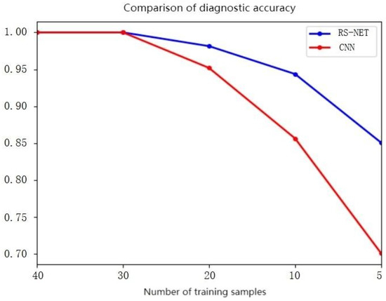 The superiority of neural networks can be clearly seen from the results. From the comparison of the above diagnosis results, it can be seen that the associated fault diagnosis model based on the deep residual shrinkage network model proposed in this paper is significantly less affected by the size of the fault samples than the traditional CNN model. This is mainly because the residual shrinkage unit in the model reduces the interference of the model with redundant data and noise and can better achieve the feature extraction and classification of the associated fault mode graphs. Through the cross-sectional comparison of test results, the fault diagnosis accuracy of both can be maintained above 70% when the amount of data is only five groups. This can prove that the construction method of clusters of associated fault modes proposed in this paper can achieve robust fault feature extraction and structured storage of noisy parameter data and has excellent performance in terms of fault diagnosis. It can alleviate the problem of insufficient data samples under actual operating conditions.