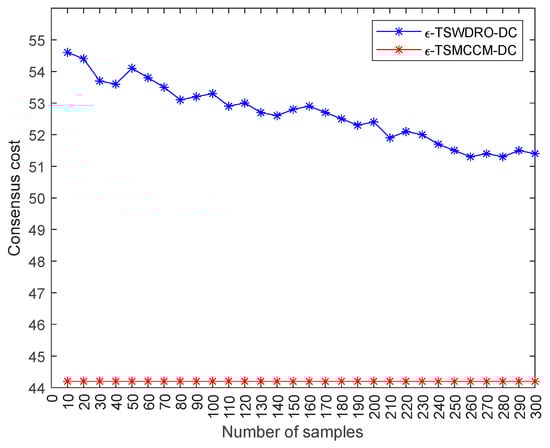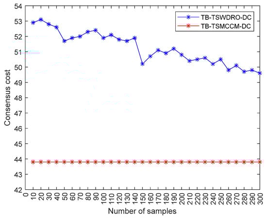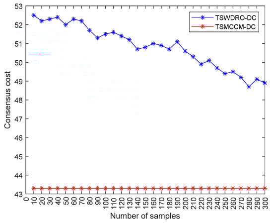 From Figure 1, Figure 2 and Figure 3, the fuzzy ensemble construction of TSWDRO-DC was influenced by the historical sample data and the results showed some volatility, reaching the optimal objective solution of 48.7 at a sample size of 280, while the result of TSMCCM-DC was constant at 43.3. Similarly, from Figure 2, at sample sizes of 260 and 280, the optimal result of 51.3 was reached by -TSMCCM-DC, where the result of 44.2 was reached using the deterministic approach. At a sample size of 300, the result of the TB-TSWDRO-DC model reached the optimal value of 49.6. Meanwhile, the result of the TB-TSMCCM-DC under the corresponding deterministic approach produced a value of 43.8. Although the cost value derived from the deterministic approach was smaller, the latter model was more conservative because it does not take the effect of risk uncertainty into account. From the perspective of the actual decision-making environment, the model proposed in this section was more consistent with the complex decision-making context, and the decision maker could flexibly choose different risk coefficients according to the current risk preference and obtain the corresponding decision results.