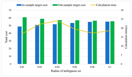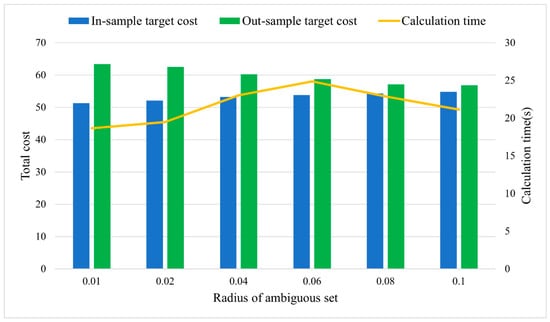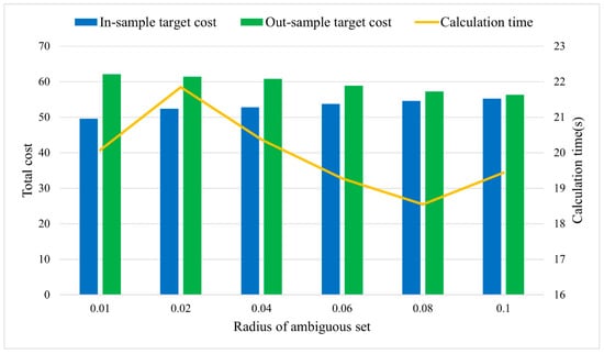 To further investigate how the in-sample performance, out-of-sample performance, and model solution time of the model varied with the radius of the Wasserstein ambiguous set in this section, a sensitivity analysis was performed. In Figure 4, Figure 5 and Figure 6, the results for different radius conditions are shown. The value of the radius specifies the size of the Wasserstein ambiguous set, and thus, the DMs can use it to adjust the conservativeness of the model. As mentioned above, as the radius increased, the ambiguous set encompassed more probability distributions, which meant that more distributions were hedged in the model. Since the model optimization in this section was about the worst-case expected cost of the ambiguous set, increasing the value of the ambiguous set radius led to a higher in-sample target cost, but the out-of-sample target cost decreased significantly initially and then stabilized. As can be seen from the orange line in the figure, increasing the radius of the Wasserstein ambiguous set did not significantly increase the computational burden, and the computational time to solve the corresponding problem fluctuated within a certain range.