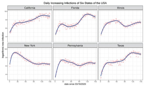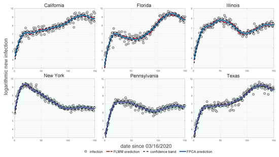 The coronavirus 2019 (COVID-19) data is typical balanced longitudinal data, which records the daily infections (transformed in logarithm) of the COVID-19 pandemic from 51 states of the United States (US), where the date is from 16 March 2020 to 14 August 2020 (Johns Hopkins COVID-19 Case Tracker: https://www.kaggle.com/datasets/thecansin/johns-hopkins-covid19-case-tracker?resource=download). Figure 1 demonstrates the profiles of daily increasing infections and the related trajectories predictions separately yielded with the R package mgcv [6] of six states in the US. From this figure, it is easy to see some basic features of large longitudinal data: (1) functionality, the daily infections of states are likely some smooth curves of time; (2) heterogeneity, different individuals usually have different trends over time; and (3) high-dimensionality, the number of observations () much larger than the number of individuals (). How to deal with this kind of large functional and longitudinal data is one of the most challenging problems in the field of high-dimensional statistics.