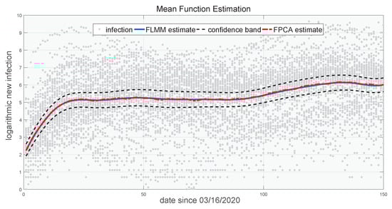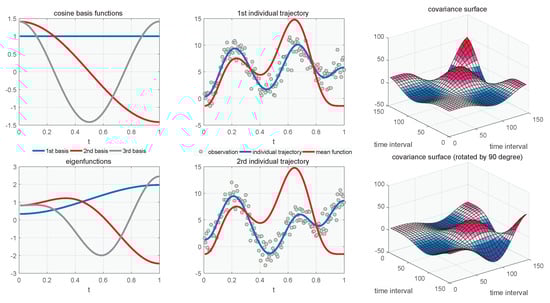 In addition, if are chosen as the eigenfunctions of the covariance function , the covariance matrix will reduce into a diagonal matrix with the eigenvalues . On the other hand, FPCA can reduce to an FLMM if the eigenfunctions are rotated for a better practical interpretation, which is subject to a similar idea of factor analysis [32]. Generally, since is never known in advance, FLMM will employ certain commonly-used basis functions and estimate empirically.