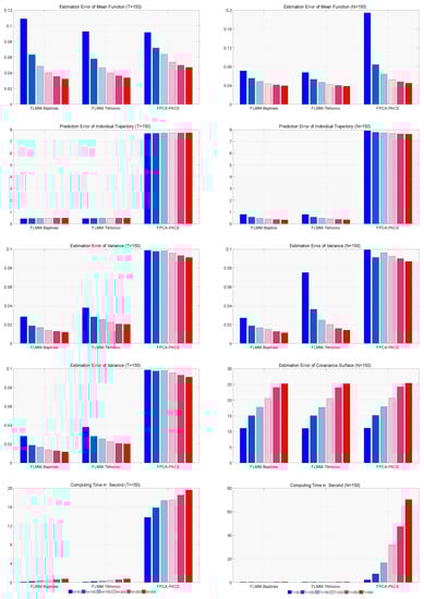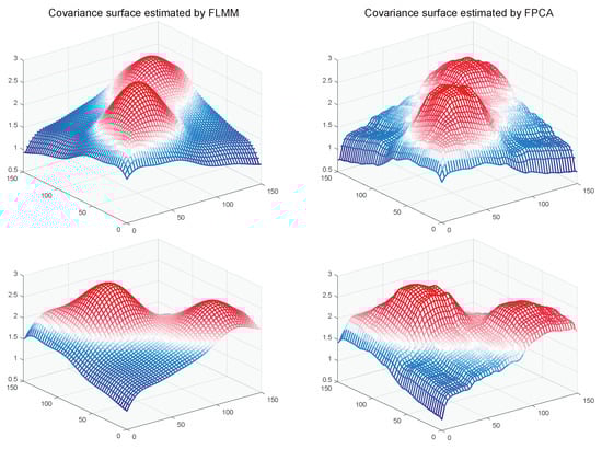 We illustrate the features of FPCA from two aspects: estimation and prediction. For estimation, FLMM does not require estimating a two-dimensional covariance surface , which is the most time-consuming component for FPCA. Besides, all terms in FLMM can be automatically estimated using many mature and effective algorithms, such as the Newton–Raphson algorithm. Whereas the main approaches for FPCA to estimate the mean and covariance are local linear modeling [10], which is based on the Kernel function, it requires determining three different bandwidths (see details in Appendix B), which is supposedly very complex in practice. For prediction, FPCA will use all the observations in addition to the local linear coefficients , which are generated in the estimation process, to predict the values of , , at any new locations (and ), which is extremely costly in implementation. In contrast, predicting these functions is trivial for FLMM: it only needs to generate a new vector and then predict the values by using , , and .