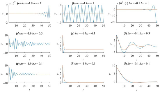 Figure 2 illustrates the various behaviors of the solutions. Solutions in points (a) and (c) are unstable, as predicted by the position of the points relative to the stability region. The solution (b) is oscillatory since point (b) is on a boundary of the stability region. All these solutions are obviously erroneous relative to the continuous prototype. Solutions obtained in points (d), (e), (g), and (h), which lie within the stability region, show dynamics that are also rather far from the real dynamics of the prototype system. Only the solutions in cases (f) and (i) are somewhat close to the real dynamics of the continuous system with respect to the truncation error. As expected, the error in (i) is lower than in (f) because (i) is closer to the origin than (f). This example clearly shows the importance of a technique that will be able to evaluate areas in the complex plane within the stability region where the investigated method is better-suited to providing the most precise numerical solution.