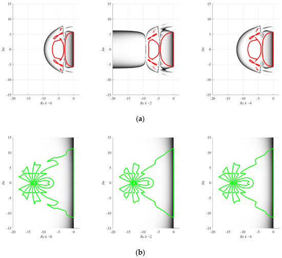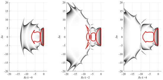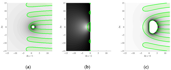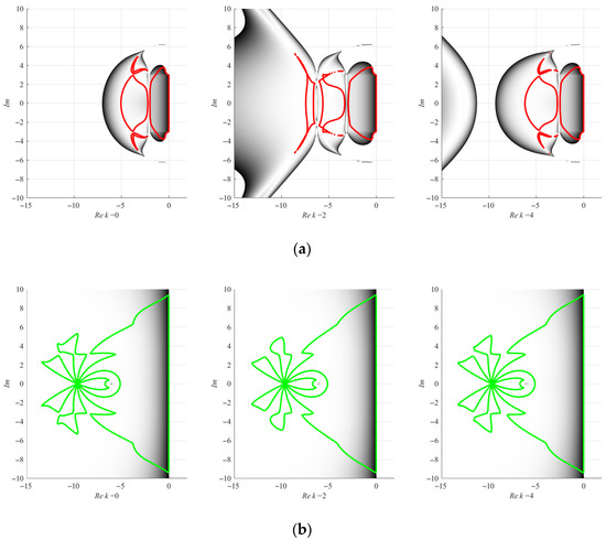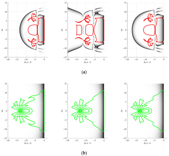 Asymmetry coefficient defines the shape of the stability region, maximizing it at , which turns the matrix into the Jordan normal form, and minimizing it at or , which turns the matrix into the Frobenius normal form. When discussing the two-dimensional problem, we should mention that, in this case, the stability region is the area in the complex plane where the absolute values of the complex conjugate eigenvalues of the matrix from Equation (4) are not greater than 1. The parameter has no impact on the shape of the stability region and is set to unity.
