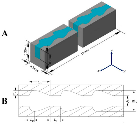 The geometrical parameter of the computational domain is demonstrated in Figure 1B with the total length (L) of 10 mm, width (W) of 0.3 mm, and the thickness of the silicon substrate (H) of 0.35 mm. The newly proposed microchannel with conical-shaped reentrant cavities consists of two parallel sidewalls with equally sized conical-shaped reentrant cavities which were periodically arranged at an equidistant from each other along the flow direction on each sidewall. The constant cross-section segment of the microchannel has the width (Wc) of 100 µm and the depth (Hc) of 200 µm. As illustrated in Figure 1B, Lcc represents the longitudinal length, Hcc is the height of a single reentrant cavity, Lp is the distance of peak point from cavity entrance, Lsc is the distance between each cavity, and Wcs represents the maximum width of the conic-shaped cavity. For the optimum thermal design, three dimensionless parameters were introduced, , , and . A fully developed velocity profile and uniform temperature profile was considered at the inlet. The substrate’s sidewalls are symmetric.