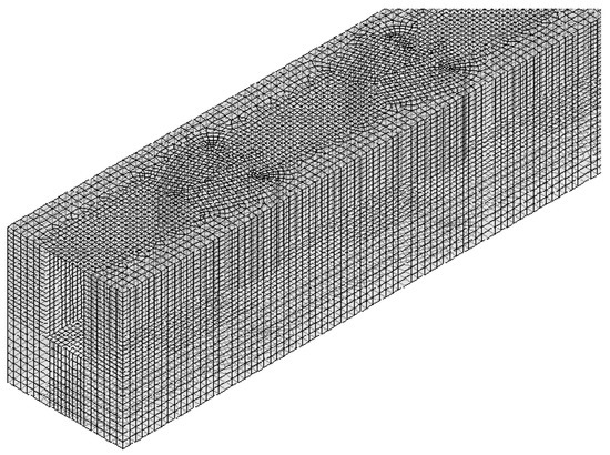 To diminish the computational time of the numerical simulation, the computational grid of the conventional MCHS was examined at different concentrations while still maintaining the precision of the results. For example, for the microchannel with β = 0.5, δ = 0.75, and γ = 2.0 when 1 ms−1, the deviation of Nusselt number for the test done with 0.168, 0.337, and 0.647 million cells from that using 1.110 million cells are 9.76%, 5.92%, and 0.93%, respectively. Therefore, the 0.647 million cells are used for the microchannel with β = 0.5, δ = 0.75 and, γ = 2.0. Figure 2 shows the mesh structure used in this numerical simulation. The local refined meshing method is used to fine tune the mesh.