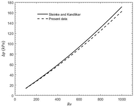 Relationship between ∆p and Re for validation of numerical simulation and Steinke Kandlikar formulation results.