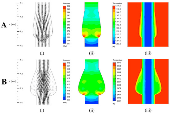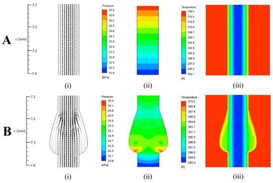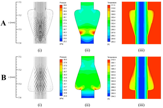 (i) velocity vectors, (ii) pressure contour and (iii) temperature contour for the microchannel with parameters at (A), , , and , and at (B), , , and .