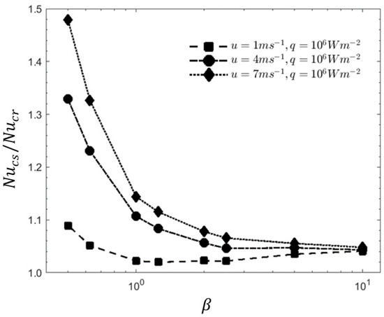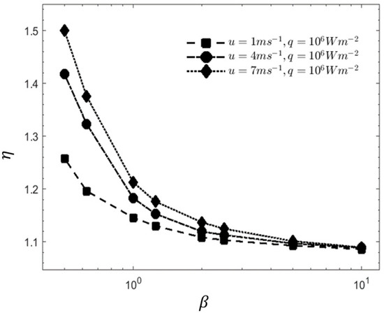 The increase in friction factor will simultaneously increase the pressure drop. To evaluate, the performance evaluation criterion (η) was adopted as the heat transfer enhancement standard evaluation method. In Figure 6, the trend shows that when at a higher value of β, the cavities are arranged further from each other by a significant distance, causing the thermal boundary layer to grow back to a fully developed condition after passing each of the cavity. This condition remains until the flow reaches the next cavity. Therefore, the increment of the thermal performance is not too much. At lower β value, the disturbance and development of the boundary layer becomes more frequent, causing in a higher η. As the number of cavities in the MCHS increases, it produces further chaotic advection in the MCHS which contributes towards a higher heat transfer performance. The highest performance can be observed at β = 0.5 when the velocity is at 7 m/s, where the value of η increases up to 1.49.