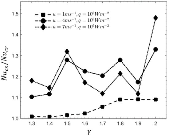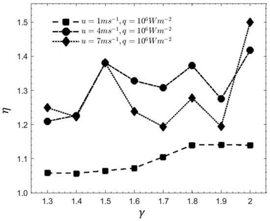 Since the size of each of the cavity is set to be constant at 0.2 mm, the increment of γ value directly represents the enlargement of the cavity size. Figure 7 shows that when u = 1 m/s, the Nucs/Nucr value decreases at γ ranging from 1.3 to 1.4, then the value increases steadily from 1.4 until 1.8, then remains almost constant until it reaches 2.0. Overall, the Nucs/Nucr values at u = 1 m/s show minimal changes and remains within 1.0 and 1.1. At u = 4 m/s, the Nucs/Nucr values increase from γ = 1.3 to 1.4, but the ratio decreases for u = 7 m/s at the same value of γ. From γ value of 1.5 to 2.0, the Nusselt number ratio fluctuates. The pattern is the same for both u values of 4 m/s and 7 m/s, but with different amplitude. The Nucs/Nucr value when u = 4 m/s is higher than at 7 m/s for γ value from 1.6 to 1.9. This indicates the complement of the transverse vortices with the conical-shaped reentrant cavity. Due to regular variation of the friction factor with γ value, the proclivity of η with γ as shown in Figure 8 shows the same form as the Nucs/Nucr, but with different amplitude. The result presented in Figure 7 is in good agreement with the results presented by Xia et al. [9].