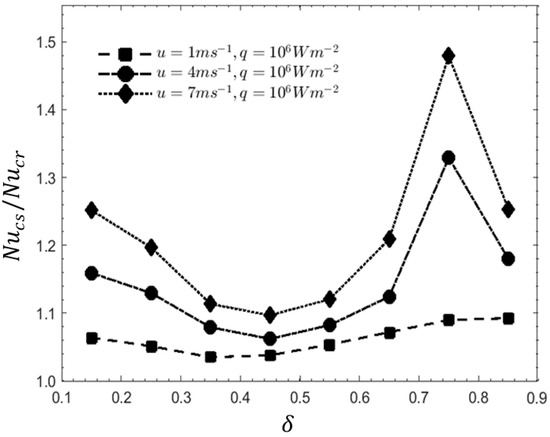 The growth of δ directly represents the position of the peak point form the entrance of the cavity and the value of δ ranging from 0.15 to 0.85. The result as presented in Figure 10 shows that for all values of u, as the value of δ increases from δ = 0.15 to δ = 0.35, the value of Nucs/Nucr decreases. For u = 1 m/s, the minimum value of Nucs/Nucr was reached at δ = 0.35, and then the value increased gradually until δ = 0.75. There was only a slight increase of the Nucs/Nucr value from δ = 0.75 to δ = 0.85. At u = 4 m/s and 7 m/s, the Nucs/Nucr value continued to decrease after δ = 0.35 until it reached the minimum value at δ = 0.45. The Nucs/Nucr then increased to its peak value at δ = 0.75, where it clearly showed that the design had reached its optimal cavity entrance angle before drastically dropping at δ = 0.85. The friction factor ratio, fcs/fcr, had a regular variation with δ, causing a similar pattern of η against δ and the Nucs/Nucr against δ with different amplitude, as shown in Figure 11.