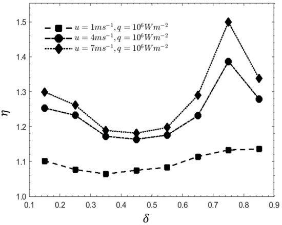 The thermal and flow performance effects was studied at various values of δ and at different u with β = 0.5 and γ = 2.0. δ is the ratio of the peak distance from the entrance of each cavity with the total length of the conic cavity and is written as