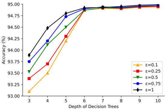 Figure 2 shows the classification accuracy at different tree depths for the Adult dataset with differential privacy noise added and privacy budgets of 0.10, 0.25, 0.50, 0.75, and 1.00, respectively. Figure 3 shows the classification accuracy at different tree depths for the Mushroom dataset with differential privacy noise added and privacy protection budgets of 0.10, 0.25, 0.50, 0.75, and 1.00, respectively.