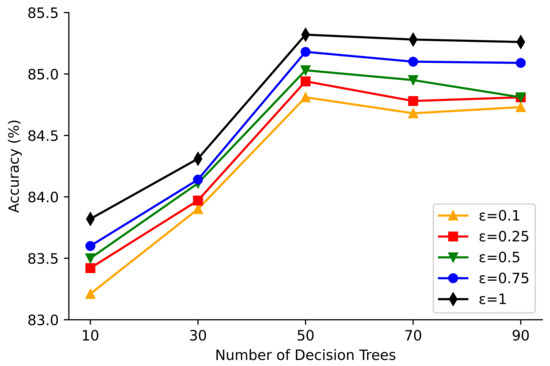 Figure 4 shows the classification accuracy for the number of decision trees in the random forest at 10, 30, 50, 70, and 90 for the Adult dataset with differential privacy noise added and privacy budgets of 0.10, 0.25, 0.50, 0.75, and 1.00, respectively. Figure 5 shows the classification accuracy of the Mushroom dataset when the number of decision trees in the random forest is 10, 30, 50, 70, and 90 when differential privacy noise is added and the privacy budget is 0.10, 0.25, 0.50, 0.75, and 1.00, respectively.