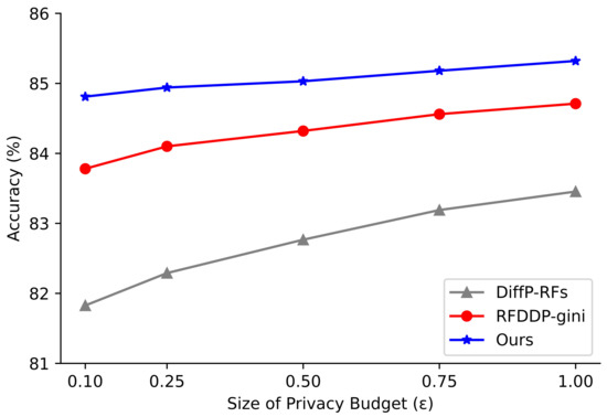 To test the effectiveness of Ours’ algorithm, multiple sets of comparison experiments are set up in this paper: (1) comparison between different decision tree depths; (2) comparison between different number of decision trees; (3) comparison between different size of privacy budgets; (4) comparison between Ours algorithm, RFDPP-gini [24] algorithm and DiffPRFs [14] algorithms in this paper.