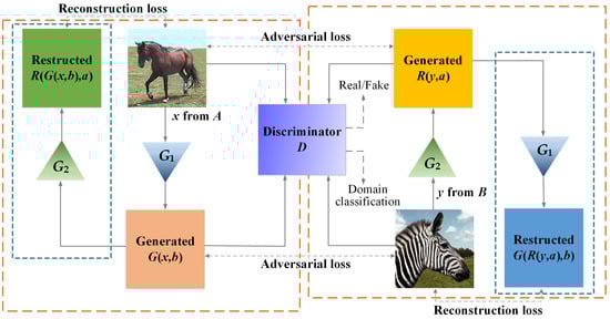 Loss functions are also called objective functions. The training process of the network is to optimize objective functions through iterative learning. Our goal is to learning two mapping functions and between two domains, A and B, as illustrated in Figure 1. Given training image (i = 1, …, M) and (j = 1, …, N), where M and N are the example numbers of A and B. There are two generators and one discriminator in MRGAN. Generator generates image from image and reconstructs image from generated , where a and b, respectively, are labels of target domain A and B. In the same way, Generator generates from and reconstructs image from generated . Discriminator D is to distinguish and from the real images guided by classifier label a and b. Therefore, two types of losses are used for generating training and adversarial training: adversarial loss for distinguishing the generated samples from the real ones as much as possible and reconstructed loss for maintaining the generative consistency of mapping G and R.