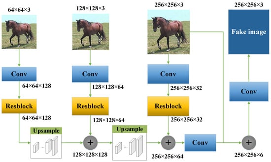 Figure 2 shows a generator network. A multi-scale layered structure is proposed in this paper to preserve the details of images as much as possible in the generator, of which a bilinear interpolation method is used to obtain three scales of images for training the generator network. In our work, an RGB image with 256 × 256 pixels is inputted into the network, and after two bilinear interpolations, the images with 128 × 128 and 64 × 64 are obtained.