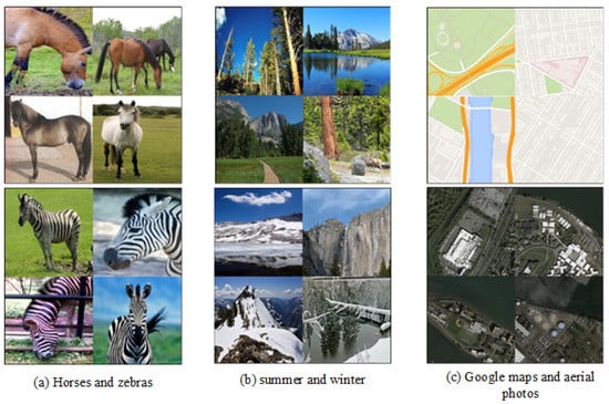 At present, GANs [15] and conditional GANs (cGANs) [16] are mainly used as image translation models to generate the target images [4,10,17,18,19,20,21]. Considering the forms of input images, these models can be divided into supervised learning and unsupervised learning. In supervised models, a large number of input-to-output image pairs are need for training networks. Although the networks are learned faster, it could be difficult and costly to find enough labeled pairs in real life, even the desired outputs cannot be well-defined in some tasks, such as object migrations and artistic stylization. Therefore, some unsupervised models are proposed to address this problem, which only need images from two domains with different styles, instead of paired data. The models can automatically learn the semantic difference between two domains and transfer an image from the source domain into the analog image looking like from the target domain. For example, in [21], a horse in an image can be transformed into a zebra with the same posture and behavior as the horse, where the original background still remains. In this way, unsupervised translation models not only do not require paired images for training, but can even produce good results when the image sizes of two domains differ by one or more orders of magnitude, as long as the image style of each domain is consistent.