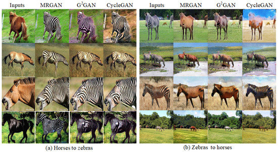 The experimental results on for object migration using MRGAN, GGAN and CycleGAN. (a) The result images of object migration from horses to zebras. (b) The result images from zebras to horses.