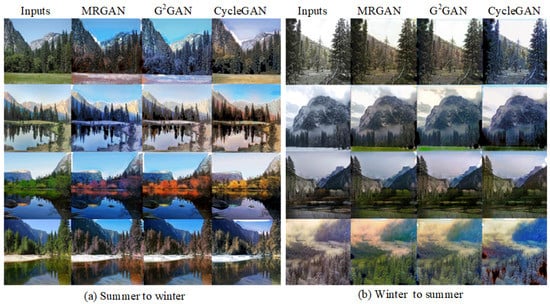 The experimental results of season conversion on dataset are shown in Figure 5. It can be seen that the color of winter images generated by MRGAN is the most realistic in Figure 5a, followed by GGAN, and CycleGAN has the worst results. In the generated results of MRGAN, the overall environment with cool color and the grassland covered with snow tend to be more consistent with the human visual perception. Nevertheless, the generated results of CycleGAN seem to be more “warm” with more yellow, and GGAN’s results feature an excessive “wintering” with more blue. Similar results are obtained for visual perception in Figure 5b.