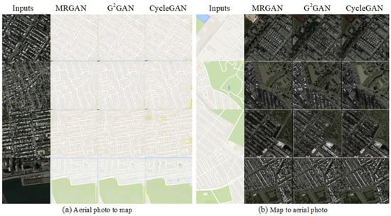 The results on map transformation task. (a,b) show the result images respectively using MRGAN, GGAN and CycleGAN for map transformation between aerial photos and 2D maps.
