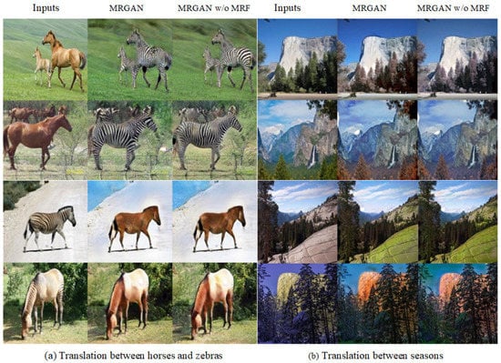 Figure 7 shows the generated results when full images (MRGAN w/o MRF) and random image blocks with 70 × 70 pixels (MRGAN) are inputted into the discriminator. We can observe that the generated images with two types of inputs are almost the same, with very small differences in details. Such a patch-input discriminator has fewer parameters than a full-image discriminator, and can be applied for arbitrarily sized images with faster execution.