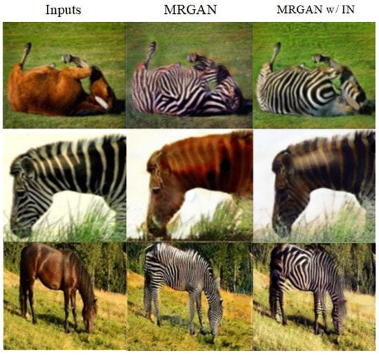 In Figure 8, we have compared the effects of different normalization methods on the results after five rounds. The model normalized by instances is denoted as MRGAN w/IN. The figure shows that the results of MRGAN with group normalization are more satisfied than those of MRGAN w/IN, while there is a more reasonable stripe distribution on zebras and clearer objects’ contours on the former.
