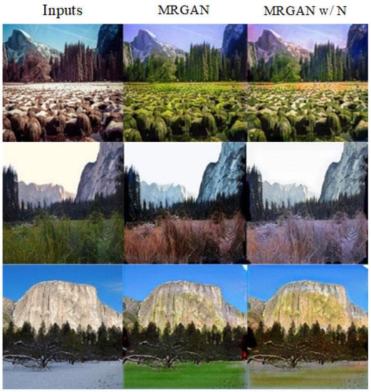 Figure 9 shows the translated results using different initializations after five rounds, Xavier parameter initialization (MRGAN) and Gaussian initialization (MRGAN w/N). The scenery color of generated images by MRGAN using the Xavier parameter initializer is more real, which demonstrates that the Xavier initializer has a positive impact on model performance.