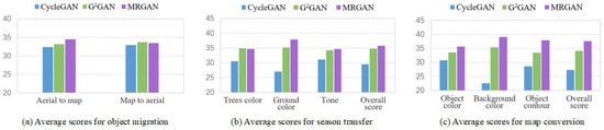 We conducted user studies to validate our work. Twenty images of each type were randomly selected separately from three test sets as inputs, and the image translation results of three tasks were obtained respectively by CycleGAN, MRGAN and DRUGAN. After shuffling the corresponding results of each input image as one group, 40 groups of images to be evaluated were finally obtained on each task. Since each task corresponds to a different set of images, we set different evaluation aspects for three tasks according to the characteristics of images, as shown in Figure 10. First, we assessed three aspects including object color, background color and object contour for the object migration between horses and zebras. We collected 36 responses per aspect on average, and a total score in each aspect for each group of results is 100. The overall scores of models were calculated according to the average scores of three aspects. Figure 10a shows that MRGAN achieves the best overall effect in the object migration between horses and zebras. We found that MRGAN obtained the best evaluations in all three aspects, especially in the aspects of the background color and the object contour, which confirms that our approach can better solve the problems of color leakage and structure instability. With two generators, GGAN had relatively strong background processing capability, and also did not differ much from MRGAN in overall evaluation, while CycleGAN achieved the lowest rating due to significant semantic loss. Second, we assessed in the same way three aspects including trees color, ground color and image tone for the season conversion between summer and winter images. On average, 36 responses per aspect were collected and the total score in each aspect was 100. Figure 10b shows the evaluated results of three aspects and the overall average scores. The results shows that MRGAN still has a significant advantage in ground color, while outscoring GGAN in trees color and tone too. Last, we conducted a third study to estimate the map transformation results. Since it is hard to intuitively distinguish the outcomes of map transformation, only boundary clarity was selected to evaluate its results. We only collected 23 available responses per group of results on average. Figure 10c shows the results of three models separately from the transformation of aerials to 2D maps and 2D maps to aerials. Although the results of three models are visually similar, the manual evaluation results can provide a reference for the analysis of the models. MRGAN had the highest overall score for transforming aerials to 2D maps, but it is only 2.1 percent higher than the lowest score of CycleGAN. This also shows the advantage of MRGAN for boundary processing. In the conversion of 2D maps to aerials, although MRGAN scored slightly lower than GGAN, it nonetheless produces faithful outputs.