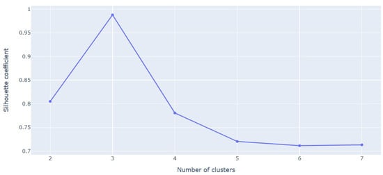 22]. The disaster susceptibility of each municipality was considered as the only variable to calculate the distance among observations and generate the clusters. A different number of clusters were tested and scored calculating the Silhouette Coefficient [