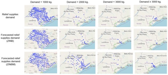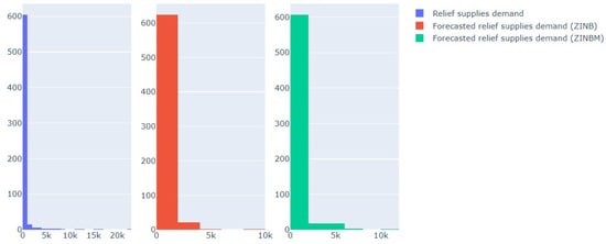 Figure 4 presents demand histograms and estimates from the models ZINB and ZINBM. Both models were able to explain the behavior of excess zeros in demand. However, high demand values, which can be inferred as a result of disaster occurrences, are better estimated by the ZINBM model.