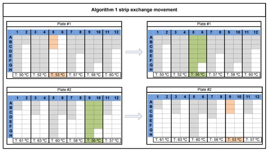 The goal of the first stage is to address groups that share temperature. At this stage, the groups will be fragmented into as few strips as possible. Although this consideration does not seem important when all the samples have to be processed at the same temperature, it plays a fundamental role in the second stage of the method by avoiding unnecessary calculations.