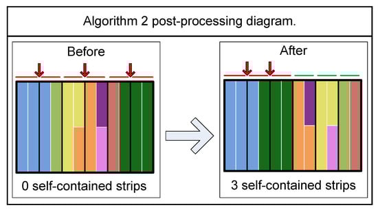 Figure 6. Diagram of post-processing applied to A2. Before processing there is no available strips to exchange (highlighted in red). However, after processing 3 strips are now self-contained and can be moved out (highlighted in green).