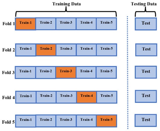 Cross-validation is a method for evaluating the performance of machine learning models accurately []. In this work, the five-fold cross-validation process shown in Figure 1 was integrated with the machine learning algorithms to improve performance, prevent overfitting, and ensure accurate prediction []. Meanwhile, the cross-validation can also reduce the training times and thus the results can be obtained efficiently.
