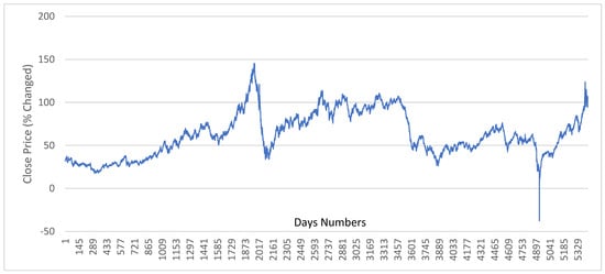 The crude oil data used in this work are obtained from Yahoo Finance [] and recorded between 2000 and 2022 and used as the dataset. This dataset includes the crude oil opening, closing, highest, and lowest prices, adjusted close price (adjusted close price means adjusted price for dividend and/or capital gain distributions) and volume data, as the features of dataset, which are described as multiple features. All these features are included in the dataset as a separate column. All the features, except the closing price are used as input in the used machine learning and deep learning methods. All data used here are used as raw data and no pre-processing or feature extraction is applied. Each column contains 5460 records. As a result, a total number of 32,760 records are utilized for training and testing procedures. The closing prices of crude oil are estimated in this work by using the described dataset. Figure 2 shows a graphical representation of the closing values in the dataset. In other words, Figure 2 depicts the appearance of the dataset that will be estimated.