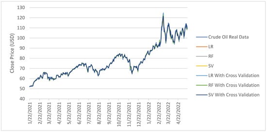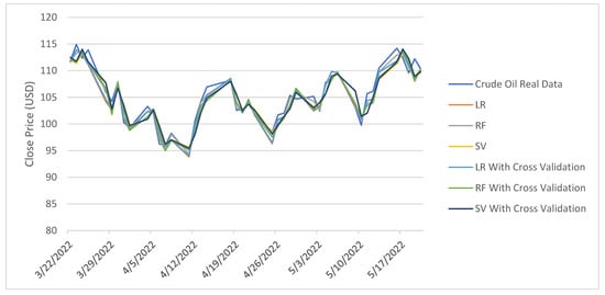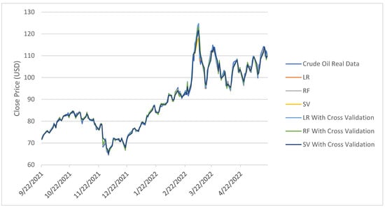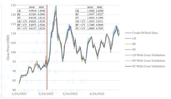 Inspired by the above observations, this paper develops a new application that forecasts the change in crude oil prices by incorporating two global effects, the COVID-19 pandemic and the Russia–Ukraine war. As compared with most existing investigations, the main contributions of this work are threefold. (1) By using multiple features, current and long-dated datasets, and cross-validation in machine learning methods, the present results can achieve higher accuracy prediction. (2) By comparing machine learning and deep learning methods, the method that can produce the best results is determined. This matter is proven by comparing the results presented in this article with the results reported in the literature. (3) The effect of two major global crises, the COVID-19 pandemic and the Russia–Ukraine war, on crude oil prices is investigated in our study. Additionally, the major impact of these crises on crude oil price forecasting is discussed in detail.