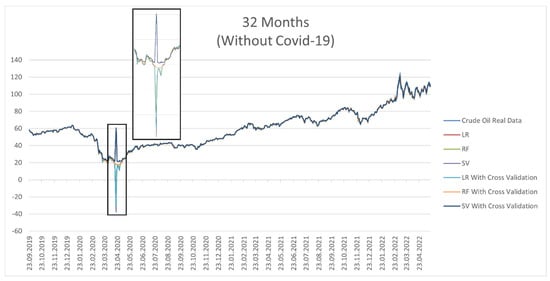 The prediction is made using data from the previous thirty-two months as in the previous experimental study and the results are shown in Figure 8. The experimental results in this case are obtained by training without using the pandemic data. As shown in the graph, the predictions made during the sharp drop in crude oil prices that occurred by closure period, which began shortly after the start of the pandemic and ended with negative values, cannot fully reflect the real values. Particularly, for SVM and RF algorithms, we are unable to predict negative values and make a reverse prediction. This situation is depicted in Figure 8. Sudden changes caused by a global crisis, such as COVID-19, pose a major challenge to the application of forecasting. Furthermore, the estimated results after the start of the war show a divergence from the real values.